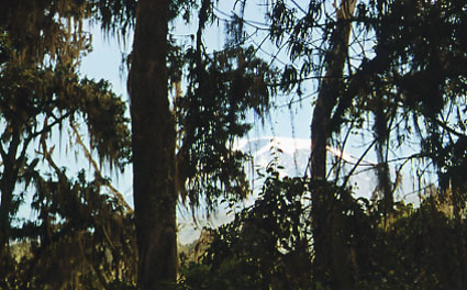 The first view of the summit of Kilimanjaro through the trees of the rain forest. Next Back